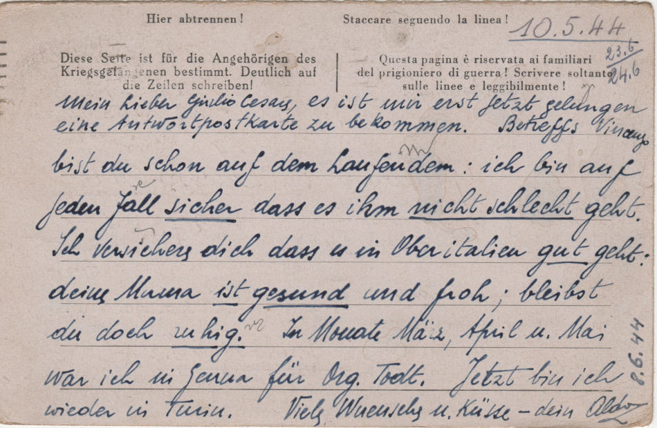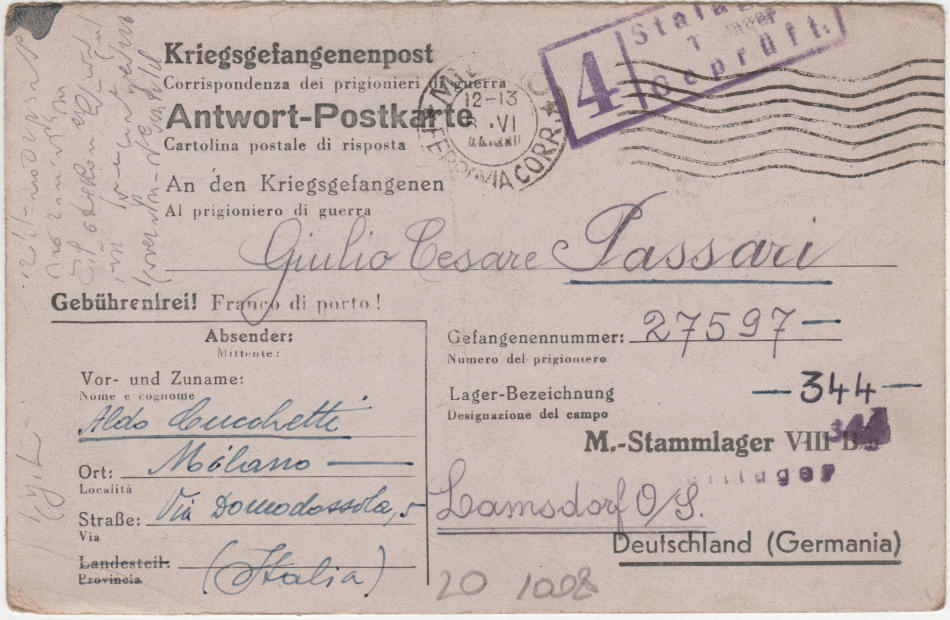 Cartolina scritta l' 8.6.1944 a Milano in Italia e spedita al campo di prigionia