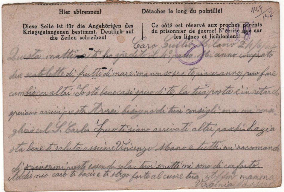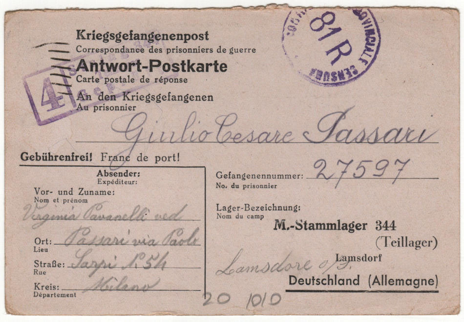 Cartolina scritta il 24.6.1944 a Milano in Italia e spedita al campo di prigionia