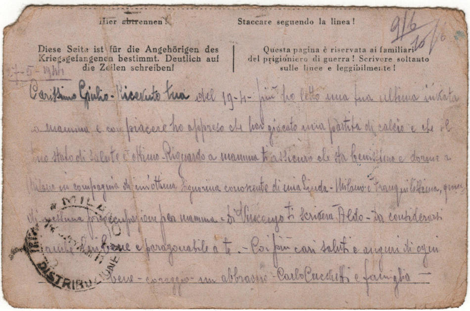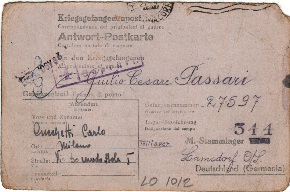 Cartolina scritta il 27.5.1944 a Milano in Italia e spedita al campo di prigionia
