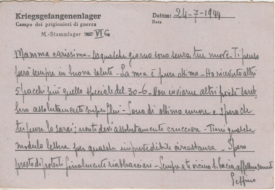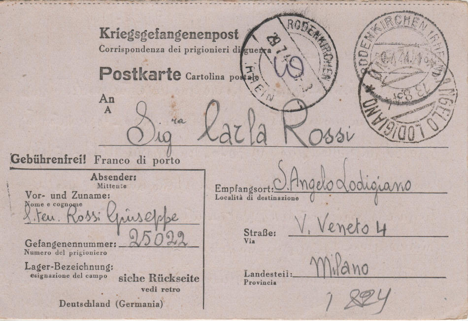 Cartolina scritta il 24 Luglio 1944 nel campo di prigionia e spedita a S.Angelo Lodigiano, provincia di Milano (ora di Lodi) in Italia