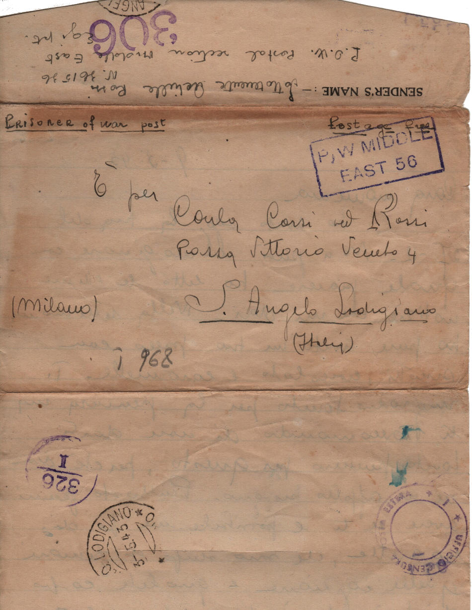Lettera scritta il 9 Marzo 1943 nel campo di prigionia e spedita a S.Angelo Lodigiano, provincia di Milano (ora di Lodi) in Italia