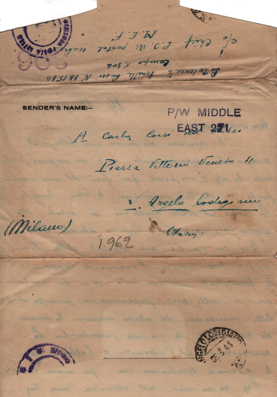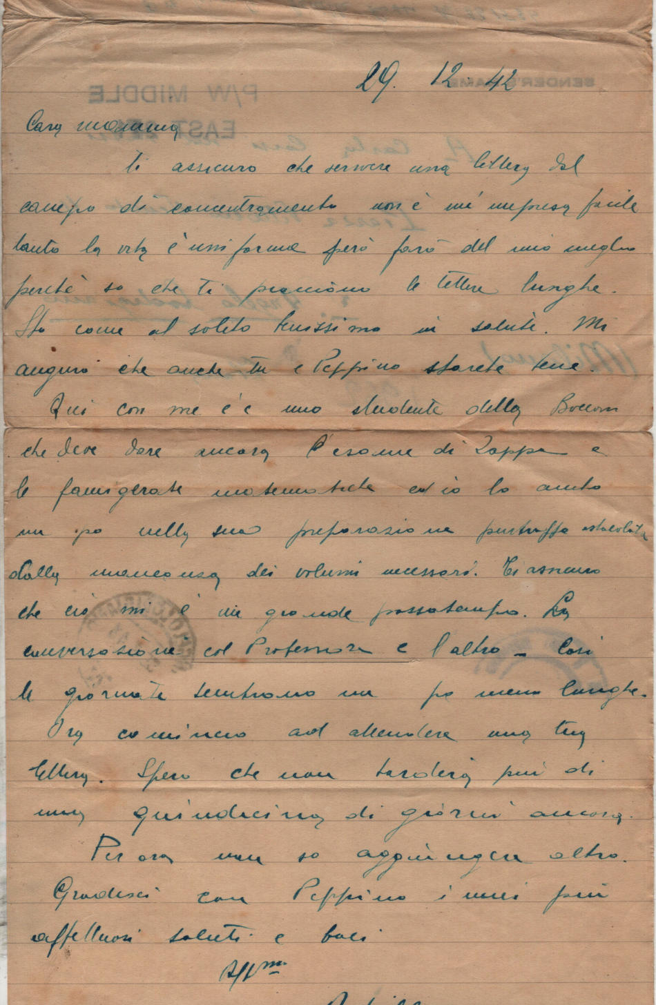 Lettera scritta il 29 Dicembre 1942 nel campo di prigionia e spedita a S.Angelo Lodigiano, provincia di Milano (ora di Lodi) in Italia
