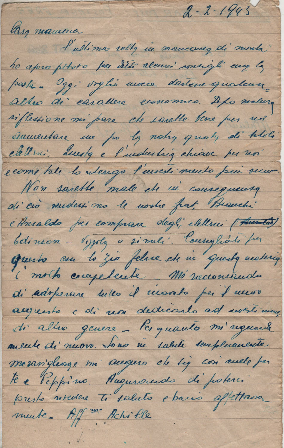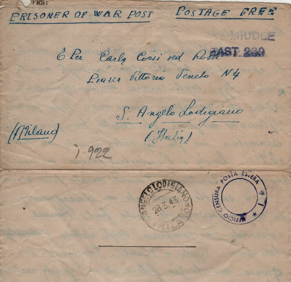 Lettera scritta il 2 Febbraio 1943 nel campo di prigionia e spedita a S.Angelo Lodigiano, provincia di Milano (ora di Lodi) in Italia