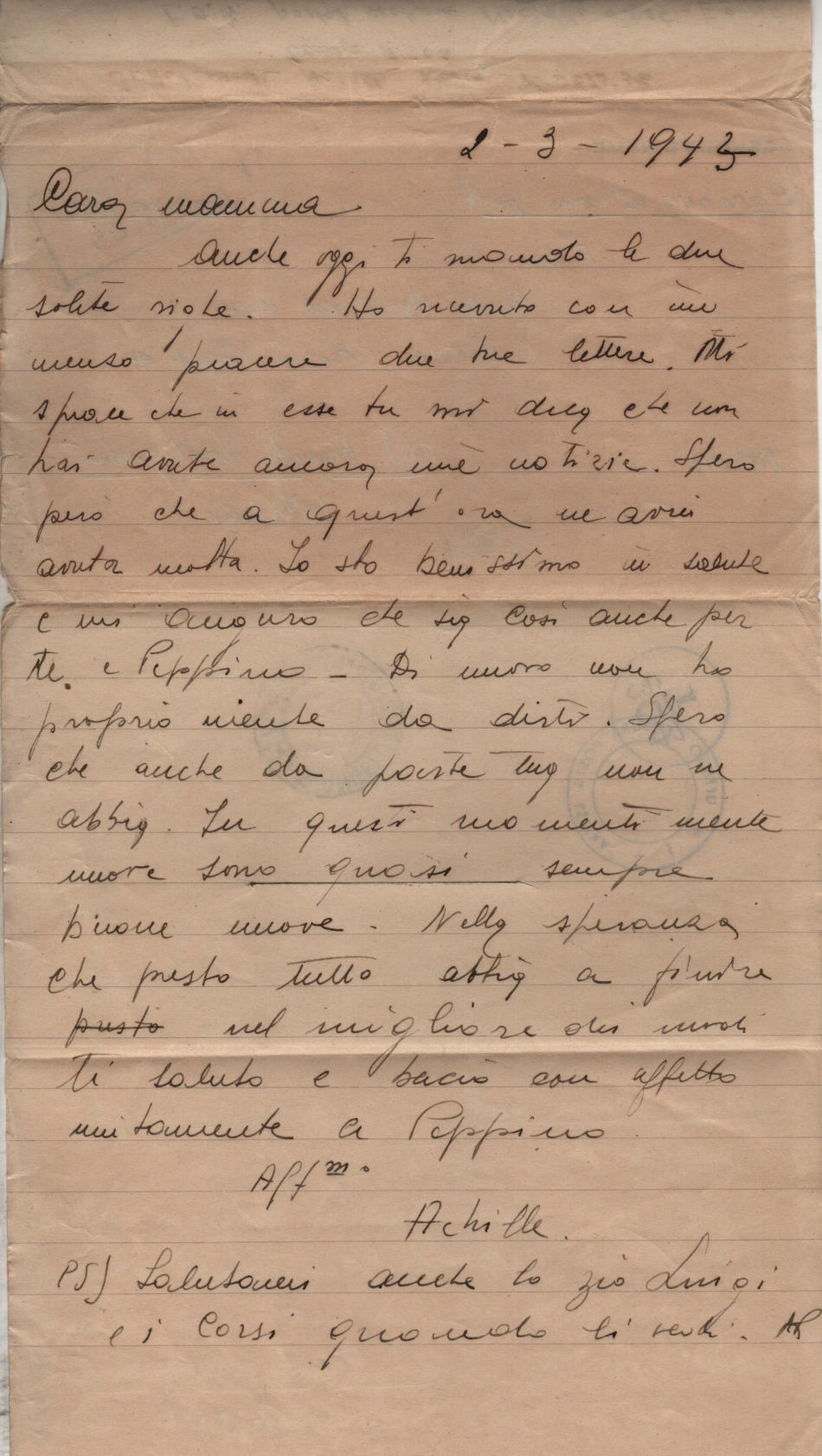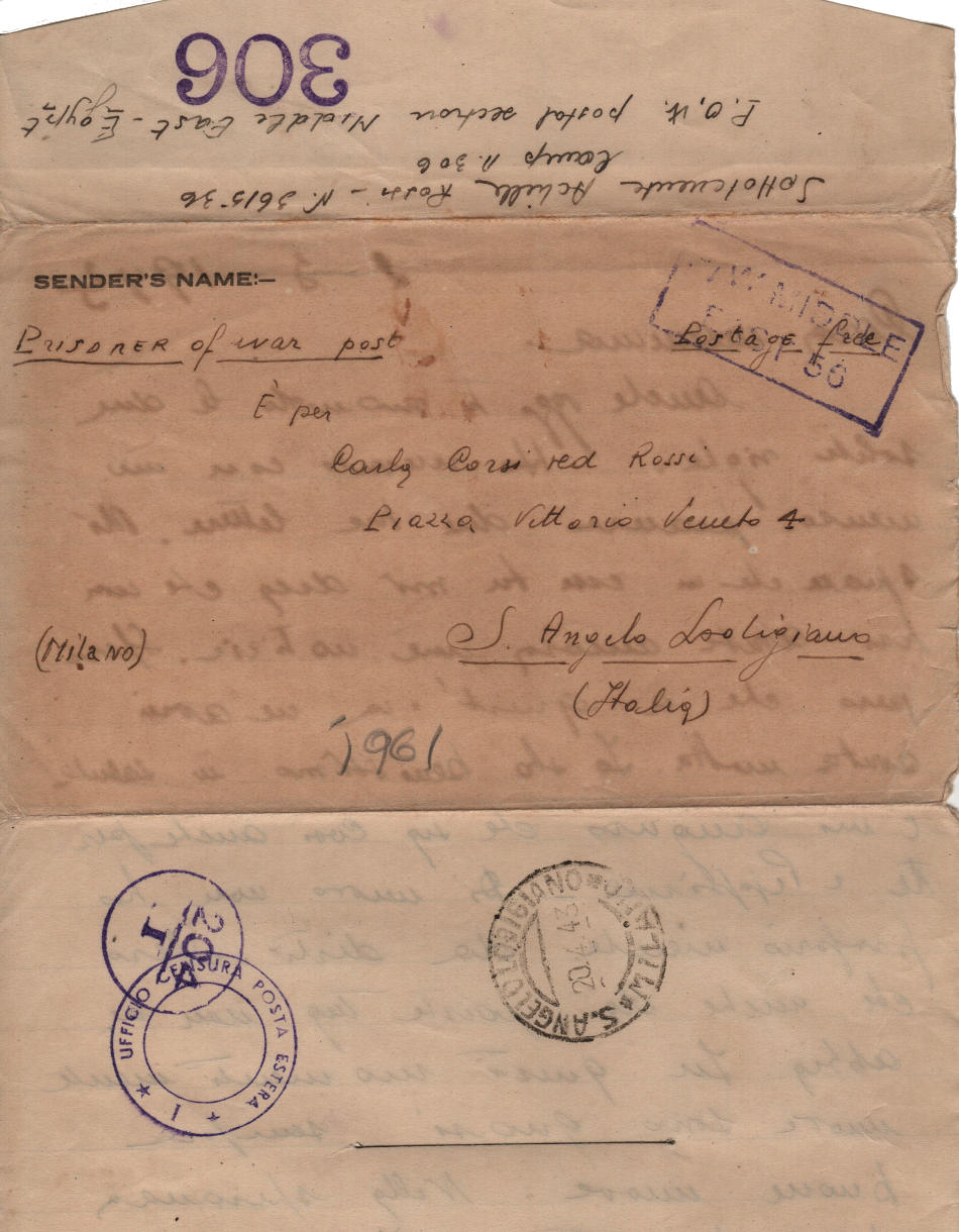Lettera scritta il 2 Marzo 1943 nel campo di prigionia e spedita a S.Angelo Lodigiano, provincia di Milano (ora di Lodi) in Italia