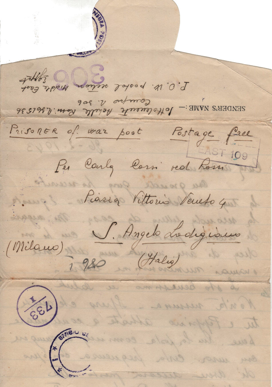 Lettera scritta il 26 Febbraio 1943 nel campo di prigionia e spedita a S.Angelo Lodigiano, provincia di Milano (ora di Lodi) in Italia