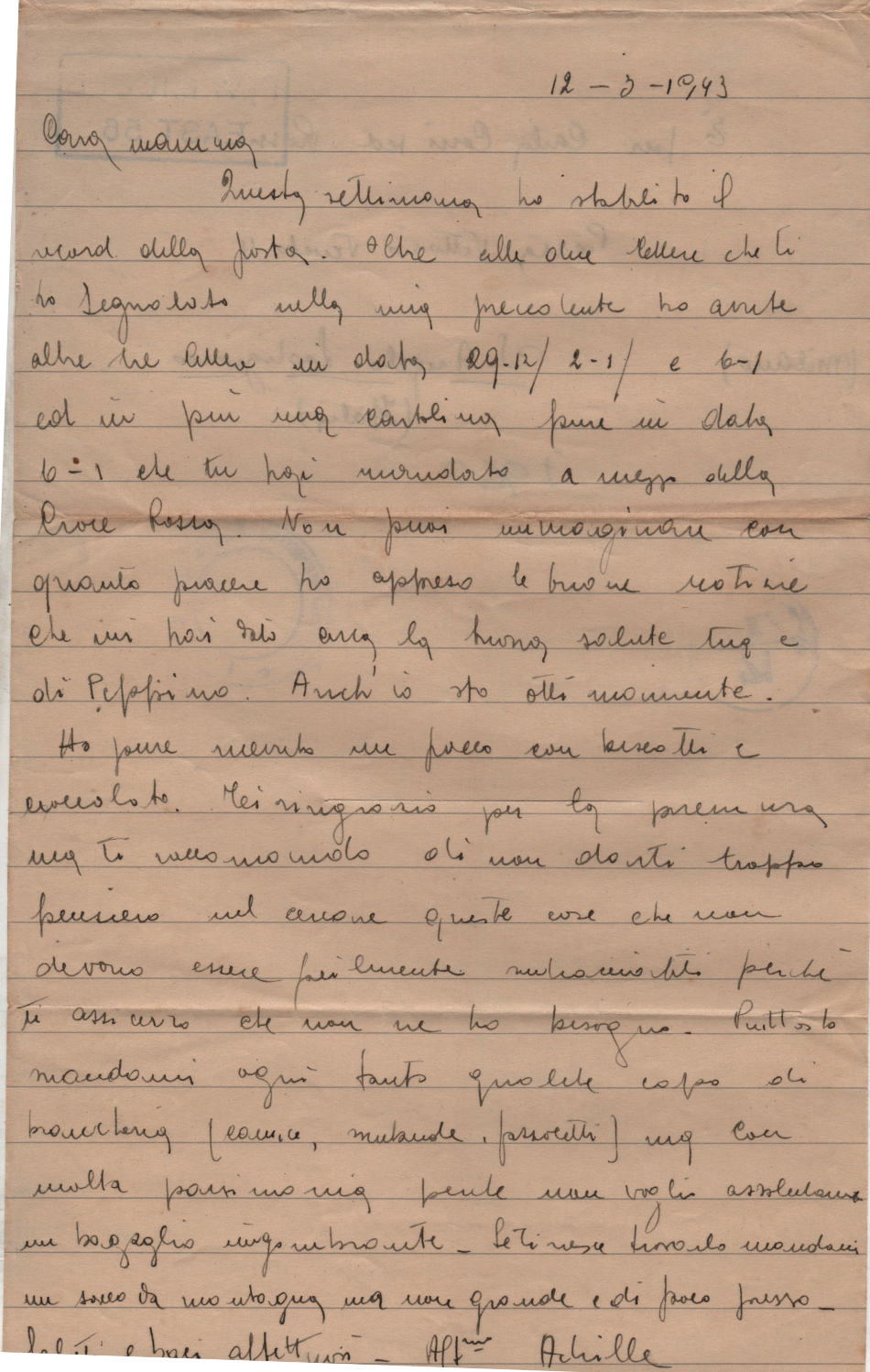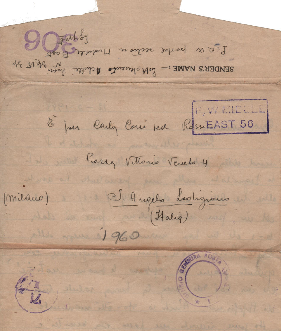 Lettera scritta il 12 Marzo 1943 nel campo di prigionia e spedita a S.Angelo Lodigiano, provincia di Milano (ora di Lodi) in Italia
