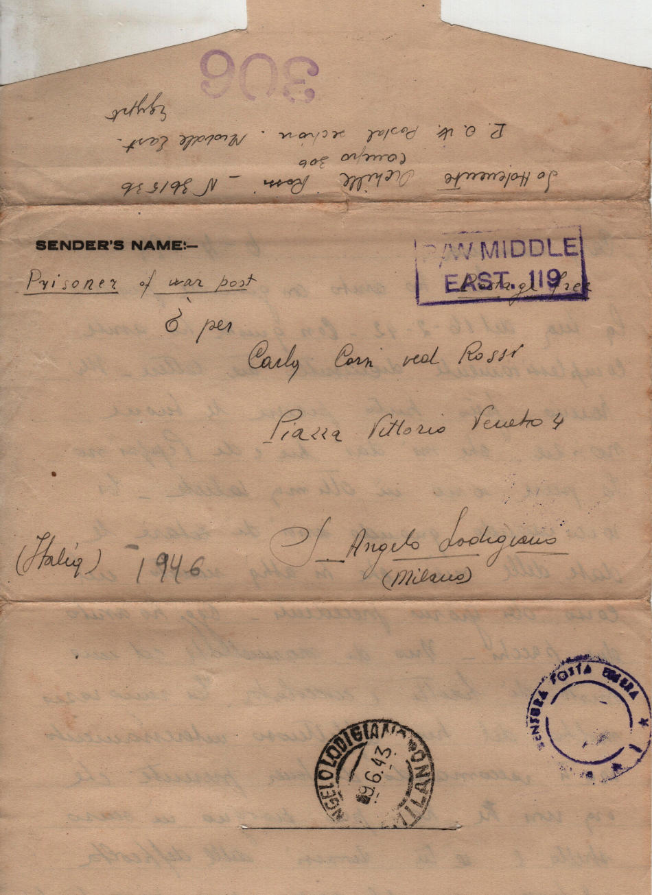 Lettera scritta il 6 Aprile 1942 nel campo di prigionia e spedita a S.Angelo Lodigiano, provincia di Milano (ora di Lodi) in Italia