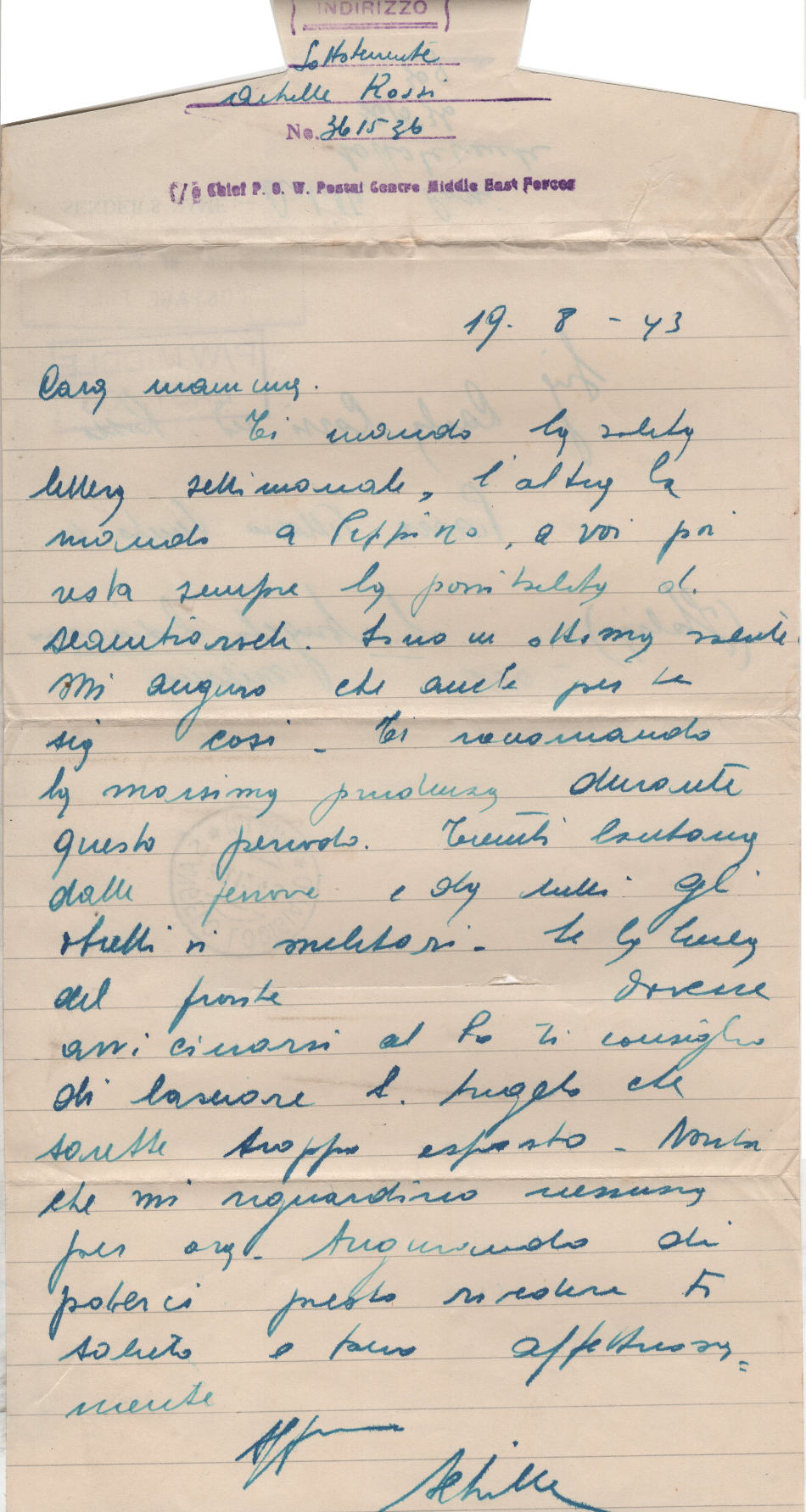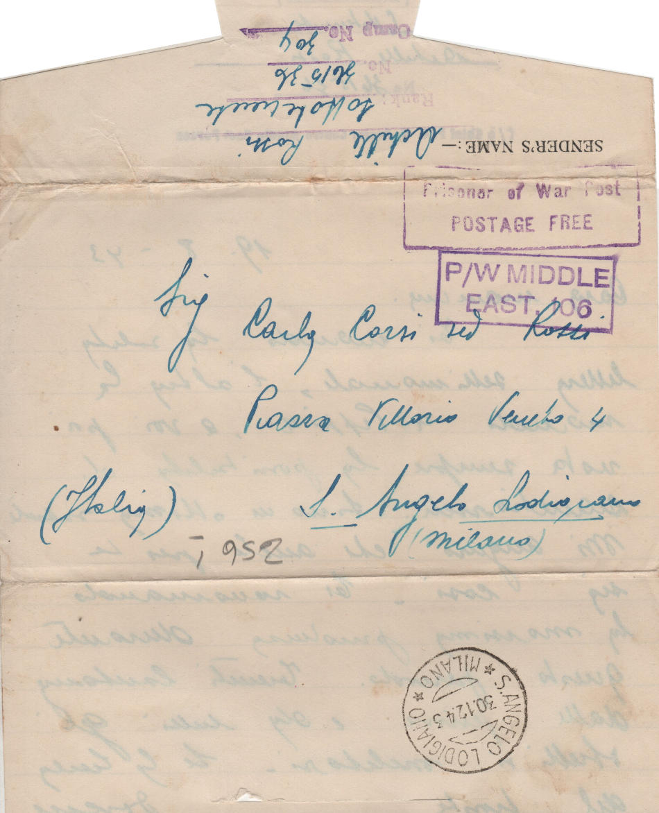Lettera scritta il 19 Agosto 1943 nel campo di prigionia e spedita a S.Angelo Lodigiano, provincia di Milano (ora di Lodi) in Italia