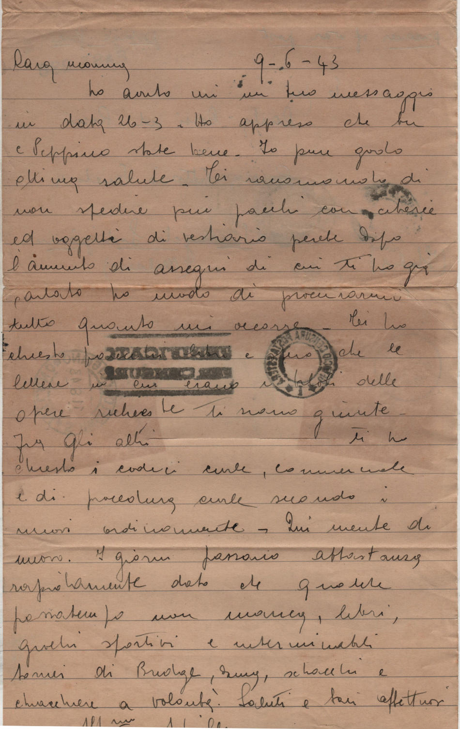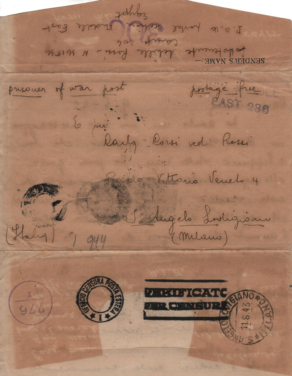 Lettera scritta il 9 Giugno 1943 nel campo di prigionia e spedita a S.Angelo Lodigiano, provincia di Milano (ora di Lodi) in Italia