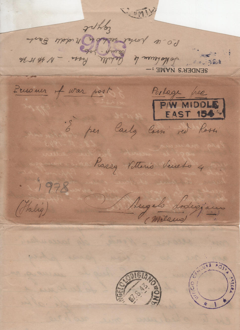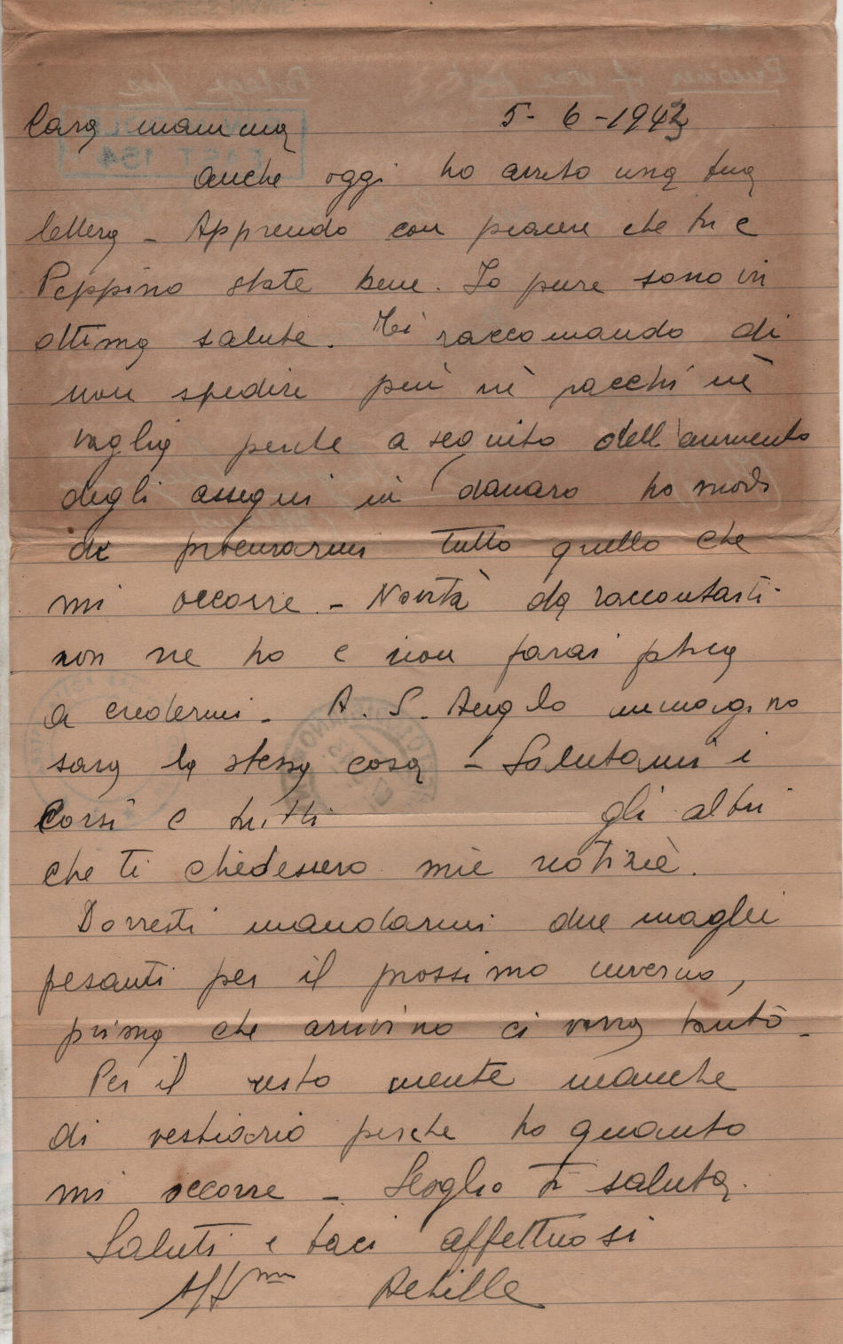 Lettera scritta il 5 Giugno 1943 nel campo di prigionia e spedita a S.Angelo Lodigiano, provincia di Milano (ora di Lodi) in Italia