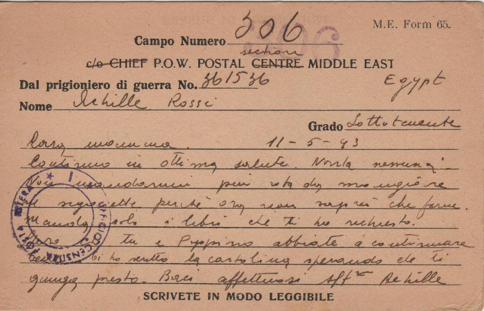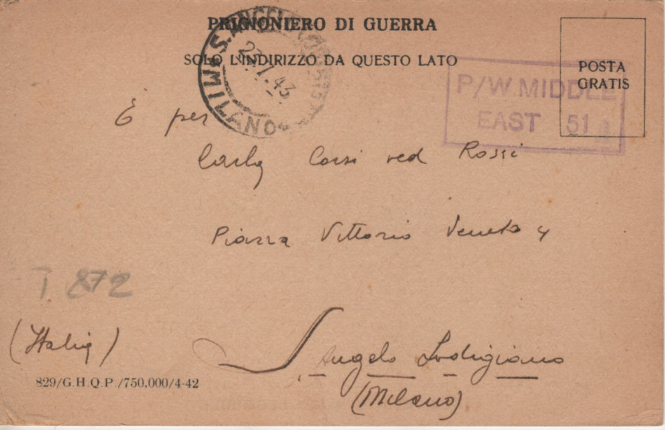 Cartolina scritta l' 11 Maggio 1943 nel campo di prigionia e spedita a S.Angelo Lodigiano, provincia di Milano (ora di Lodi) in Italia