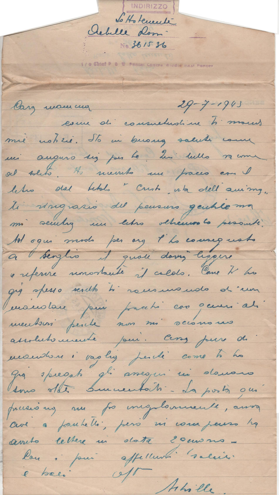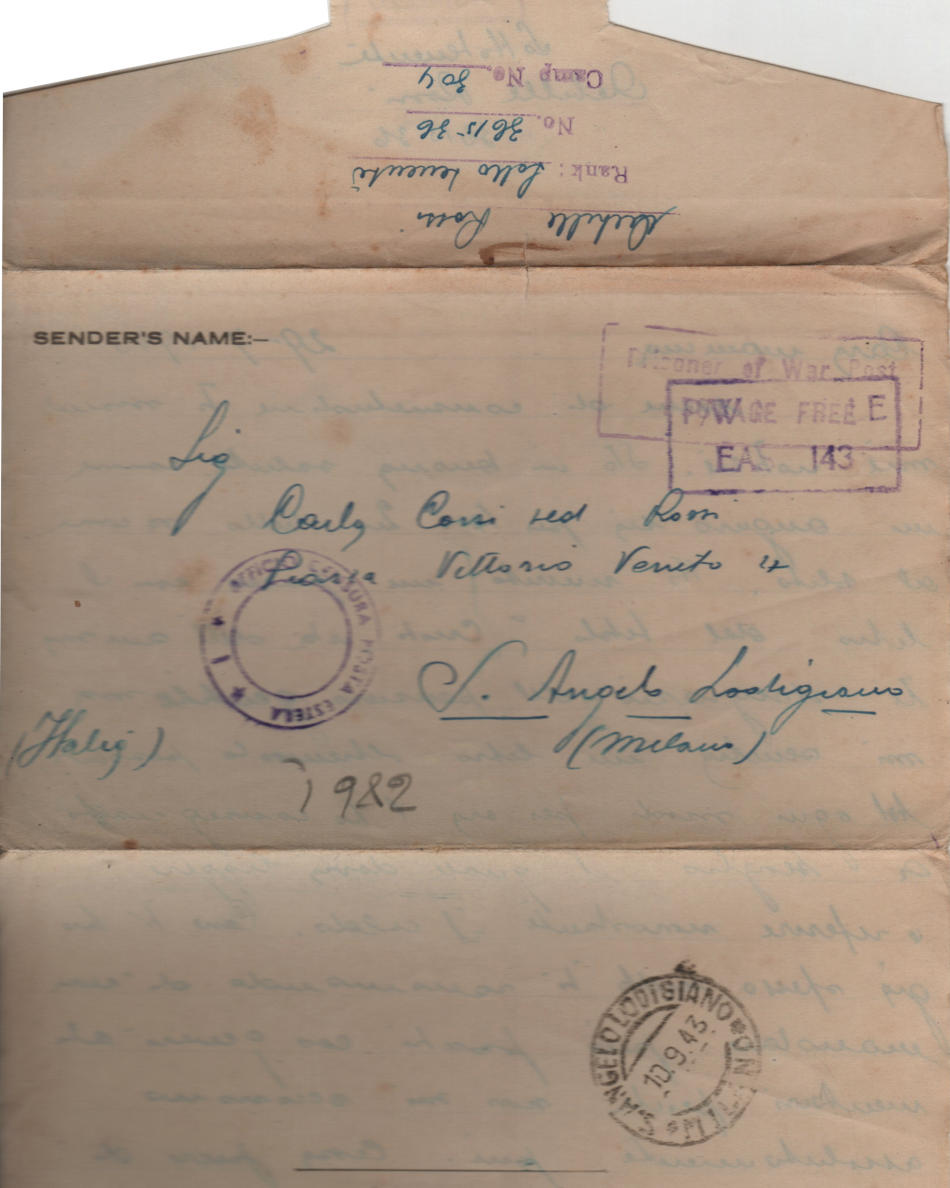 Lettera scritta il 29 Luglio 1943 nel campo di prigionia e spedita a S.Angelo Lodigiano, provincia di Milano (ora di Lodi) in Italia