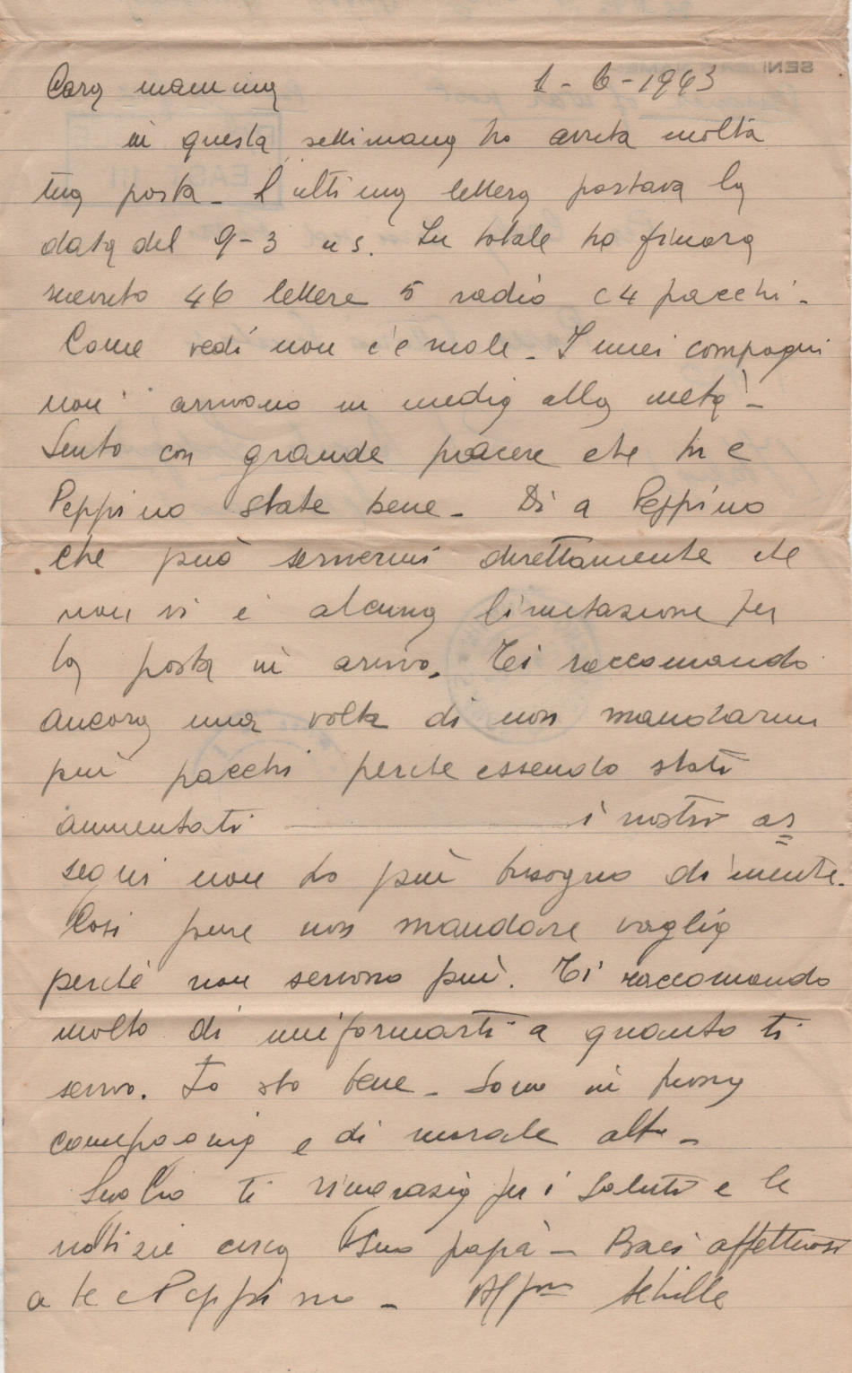 Lettera scritta il 1. Giugno 1943 nel campo di prigionia e spedita a S.Angelo Lodigiano, provincia di Milano (ora di Lodi) in Italia