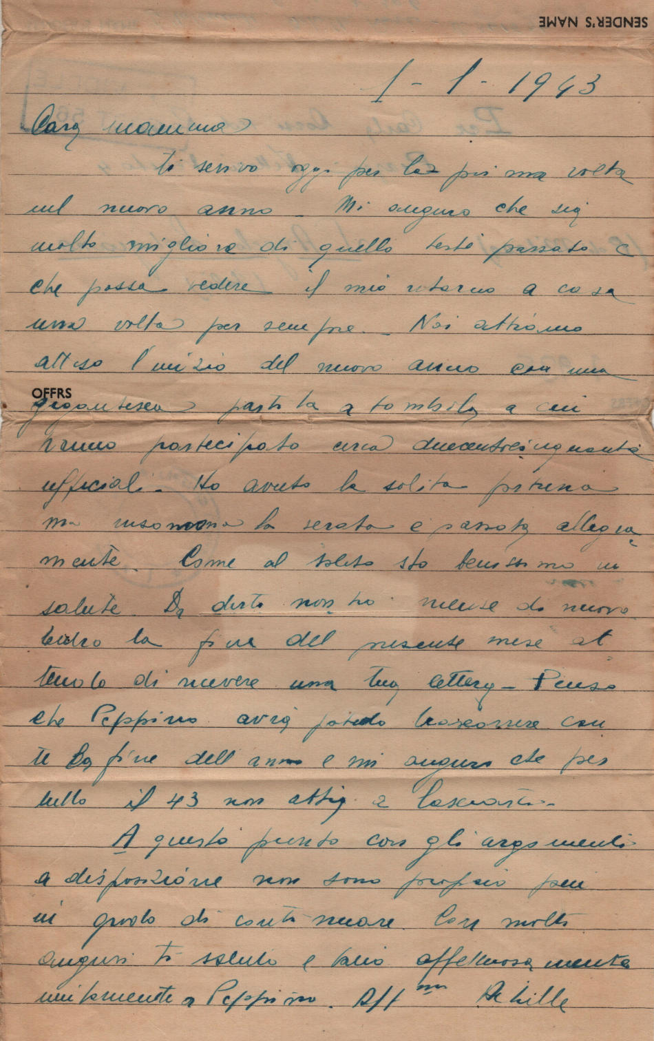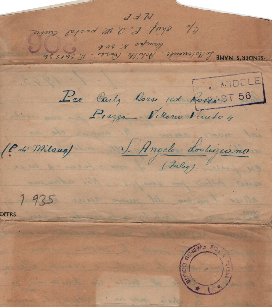 Lettera scritta il 1. Gennaio 1943 nel campo di prigionia e spedita a S.Angelo Lodigiano, provincia di Milano (ora di Lodi) in Italia