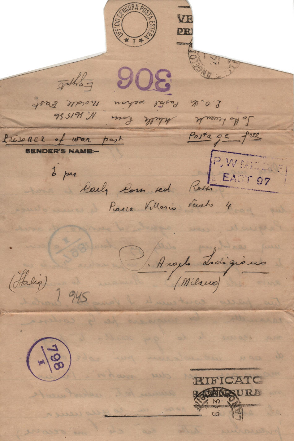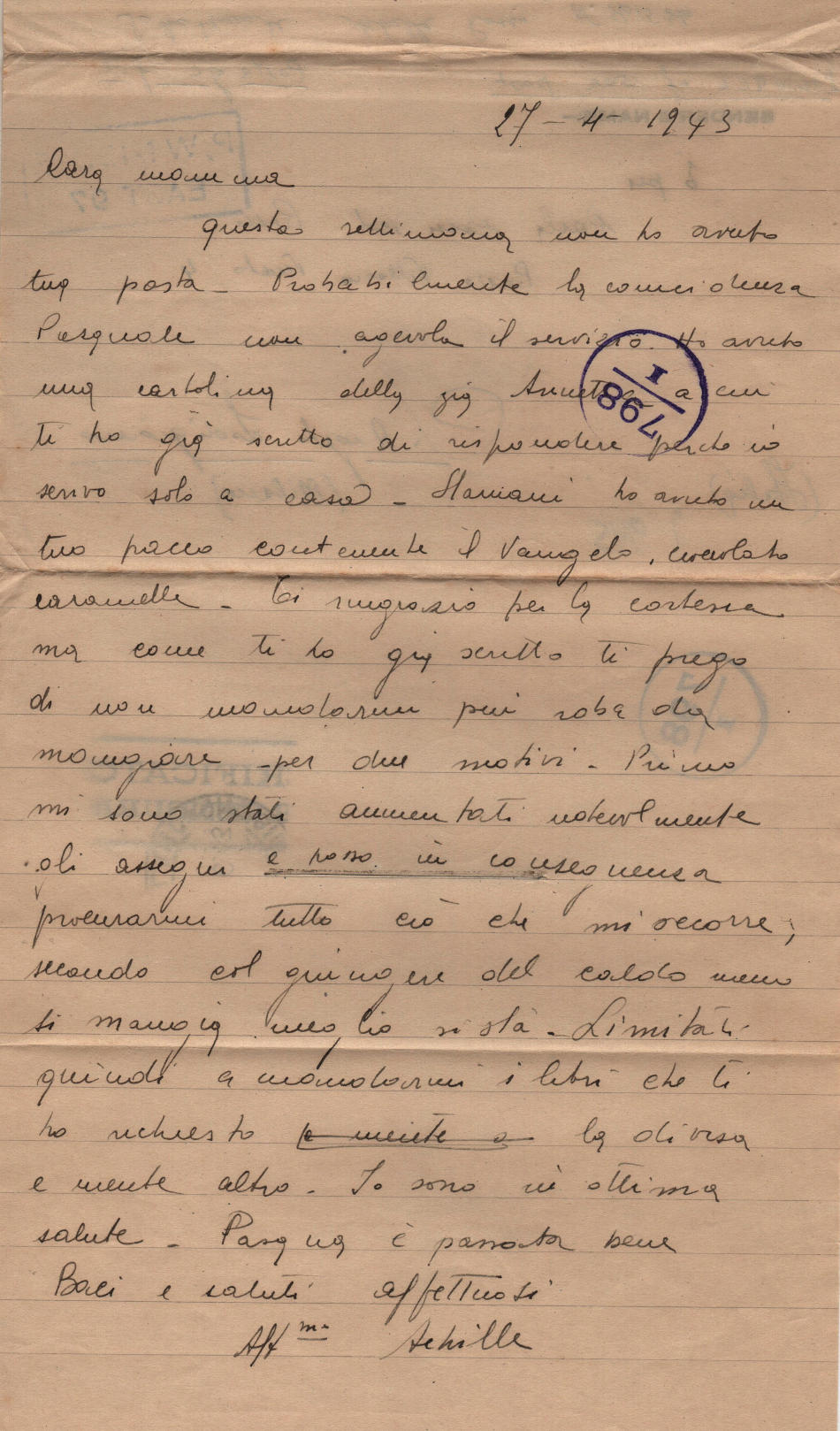 Lettera scritta il 27 Aprile 1943 nel campo di prigionia e spedita a S.Angelo Lodigiano, provincia di Milano (ora di Lodi) in Italia