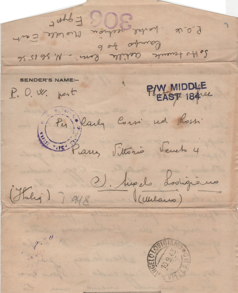 Lettera scritta il 19 Giugno 1943 nel campo di prigionia e spedita a S.Angelo Lodigiano, provincia di Milano (ora di Lodi) in Italia