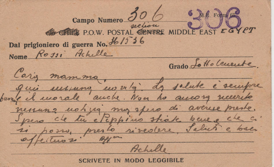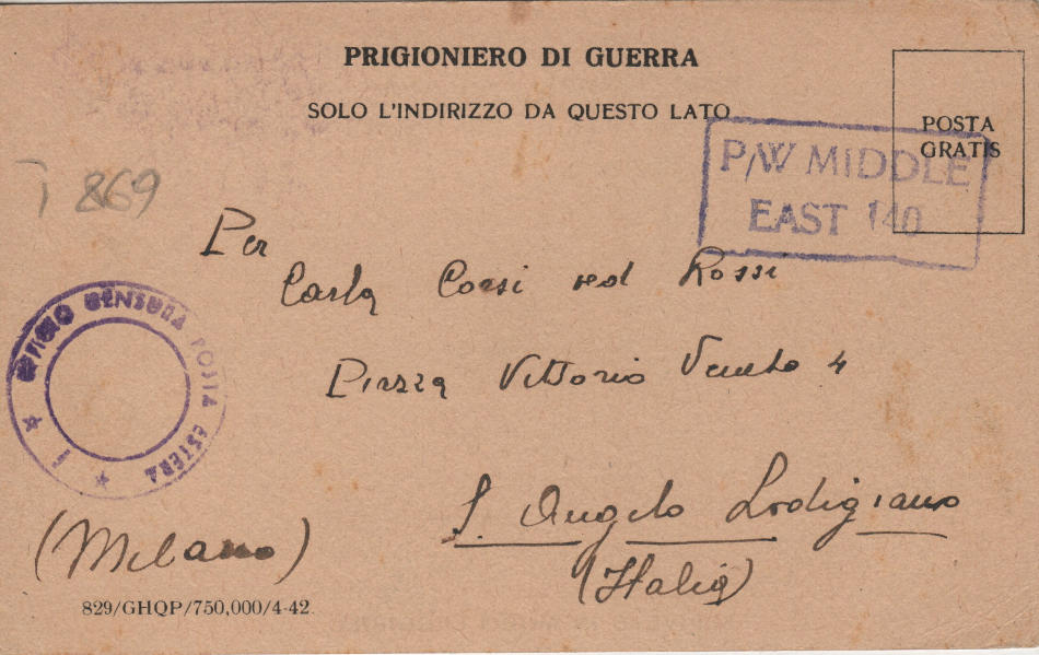 Cartolina scritta nel campo di prigionia (senza data) e spedita a S.Angelo Lodigiano, provincia di Milano (ora di Lodi) in Italia