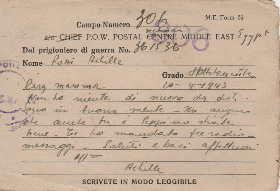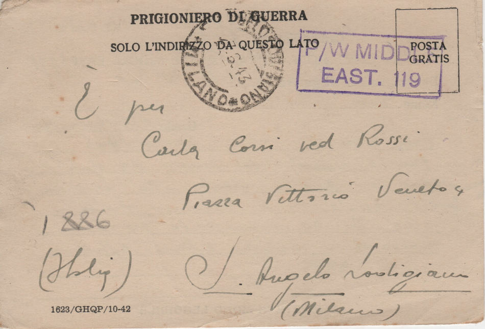 Cartolina scritta il 20 Aprile 1943 nel campo di prigionia e spedita a S.Angelo Lodigiano, provincia di Milano (ora di Lodi) in Italia