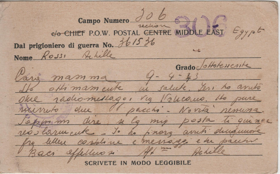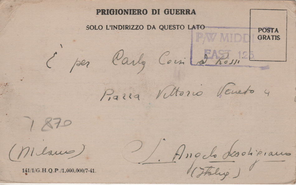 Cartolina scritta il 9 Aprile 1943 nel campo di prigionia e spedita a S.Angelo Lodigiano, provincia di Milano (ora di Lodi) in Italia