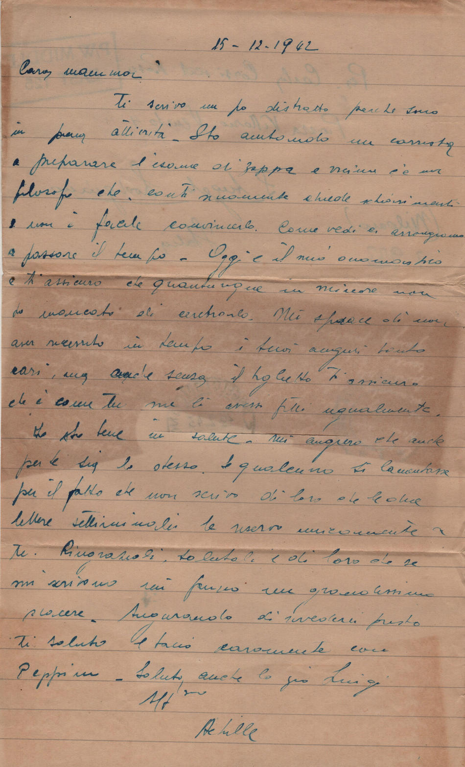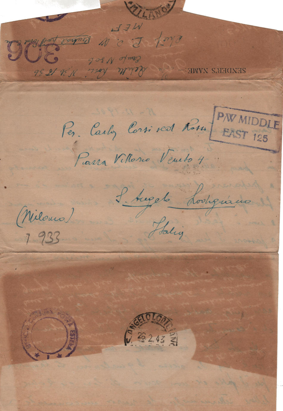 Lettera scritta il 15 Dicembre 1942 nel campo di prigionia e spedita a S.Angelo Lodigiano, provincia di Milano (ora di Lodi) in Italia