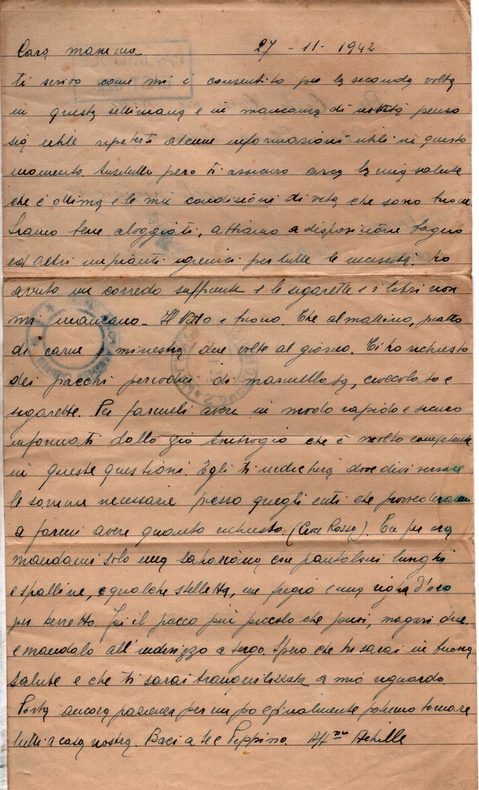 Lettera scritta il 27 Novembre 1942 nel campo di prigionia e spedita a S.Angelo Lodigiano, provincia di Milano (ora di Lodi) in Italia