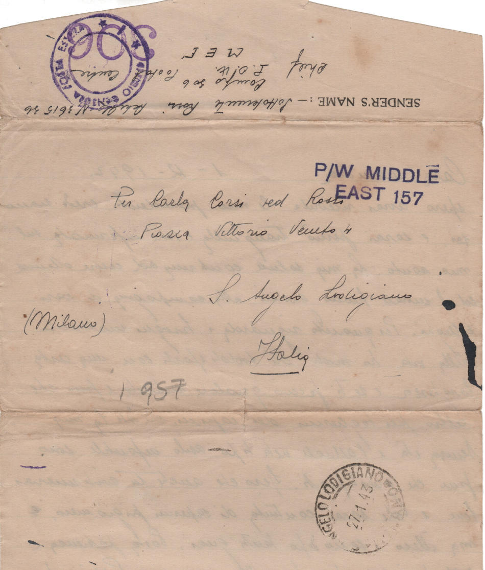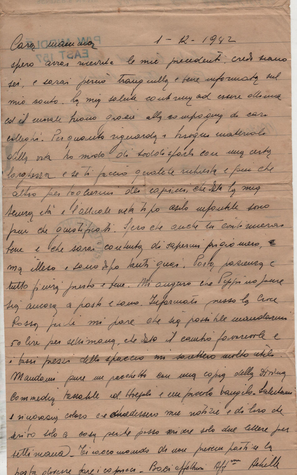 Lettera scritta il 1. Dicembre 1942 nel campo di prigionia e spedita a S.Angelo Lodigiano, provincia di Milano (ora di Lodi) in Italia