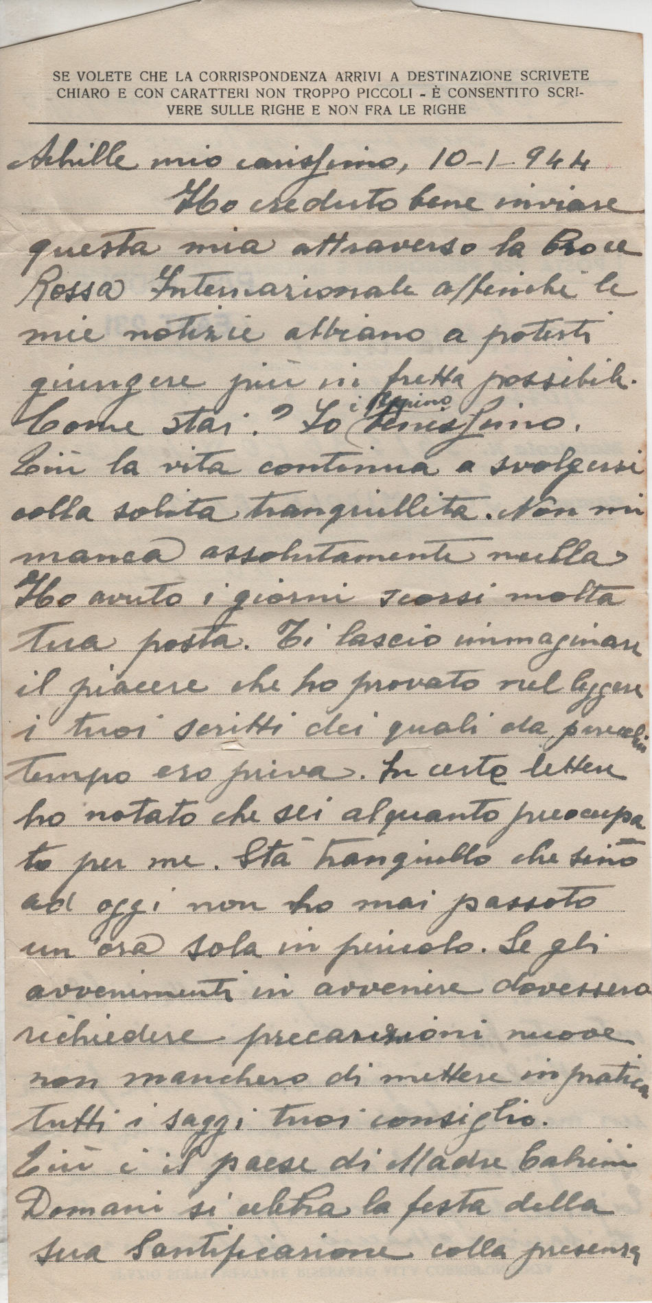 Lettera scritta il 10 Gennaio 1944 a S.Angelo Lodigiano, provincia di Milano (ora di Lodi) in Italia e spedita al campo di prigionia