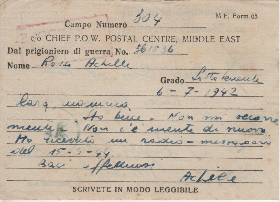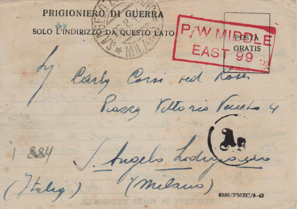 Cartolina scritta il 6 Luglio 1944 nel campo di prigionia e spedita a S.Angelo Lodigiano, provincia di Milano (ora di Lodi) in Italia