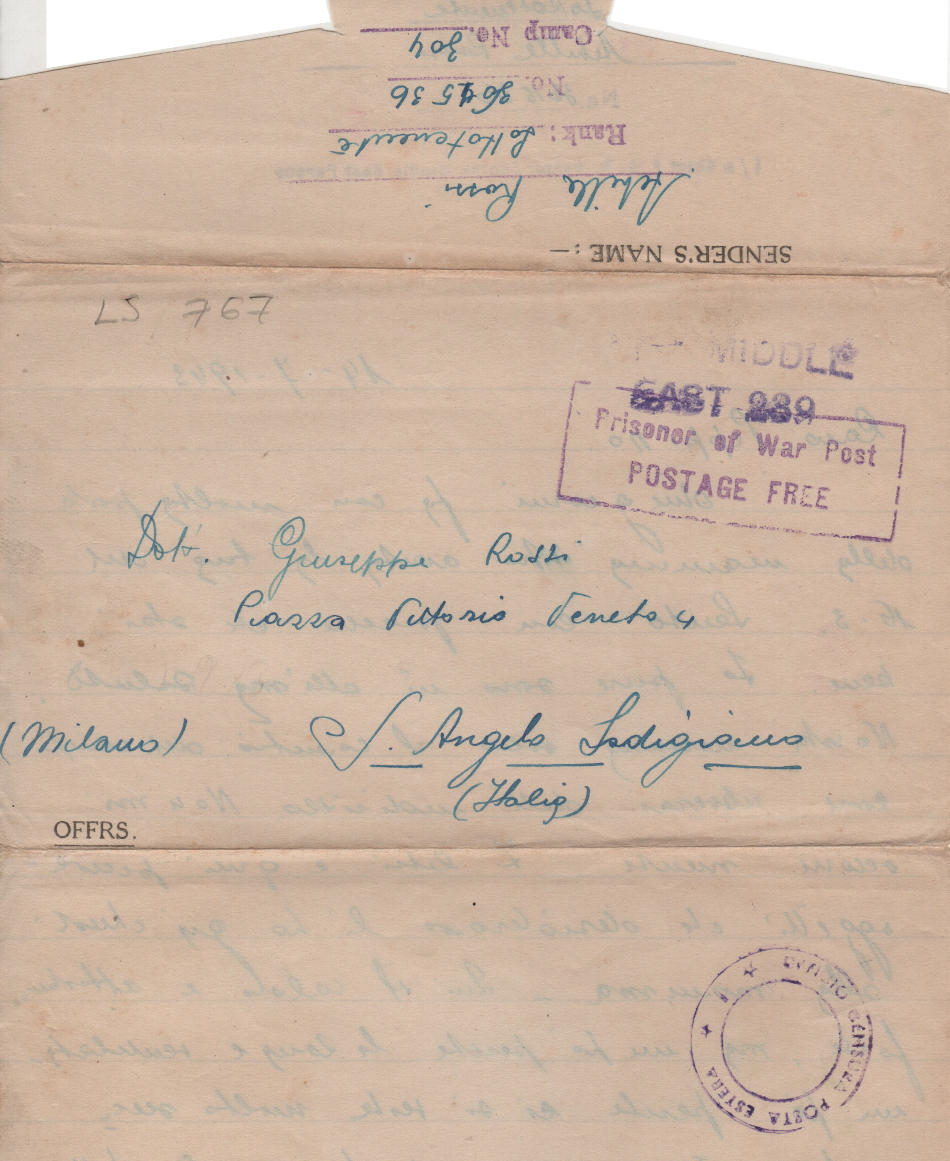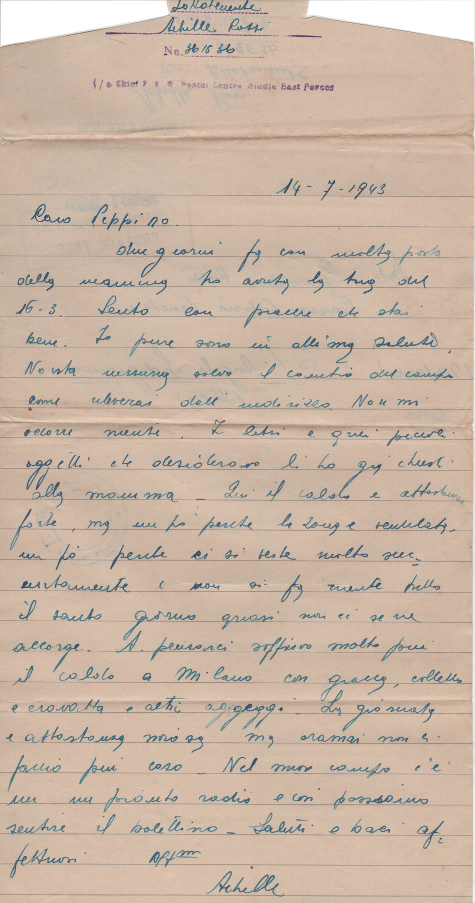 Lettera scritta il 14 Luglio 1943 nel campo di prigionia e spedita a S.Angelo Lodigiano, provincia di Milano (ora di Lodi) in Italia