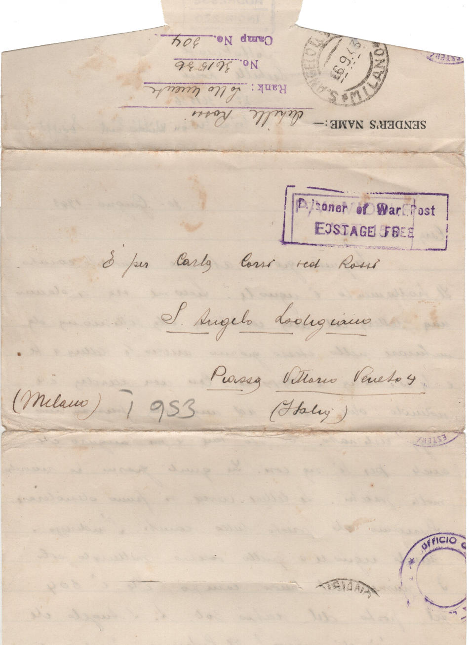 Lettera scritta il 30 Giugno 1943 nel campo di prigionia e spedita a S.Angelo Lodigiano, provincia di Milano (ora di Lodi) in Italia