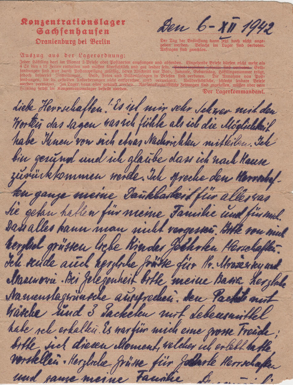 Lettera scritta il 6.12.1942 nel campo di concentramento e spedita a Jedrzejow, nel voivodato di Świętokrzyskie (Polonia)