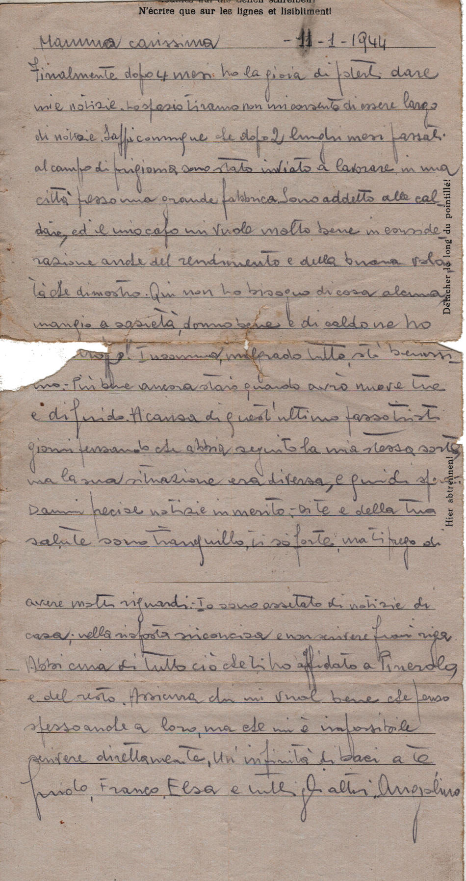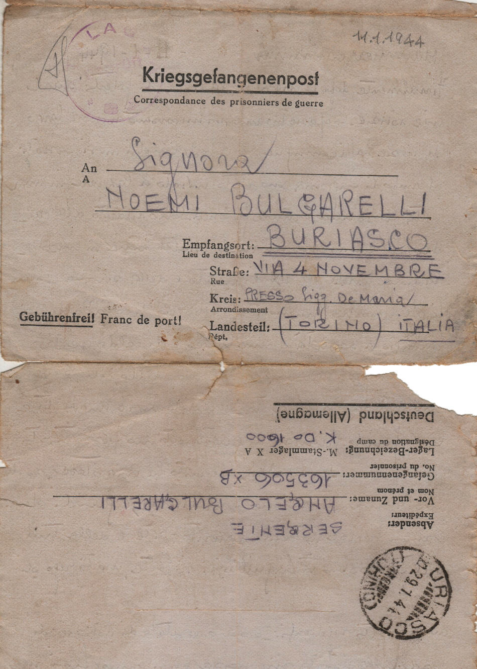 Lettera scritta l' 11.1.1944 nel campo di prigionia e spedita a Buriasco (Torino) in Italia