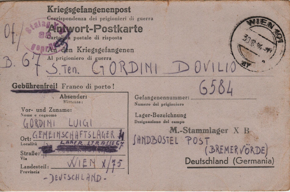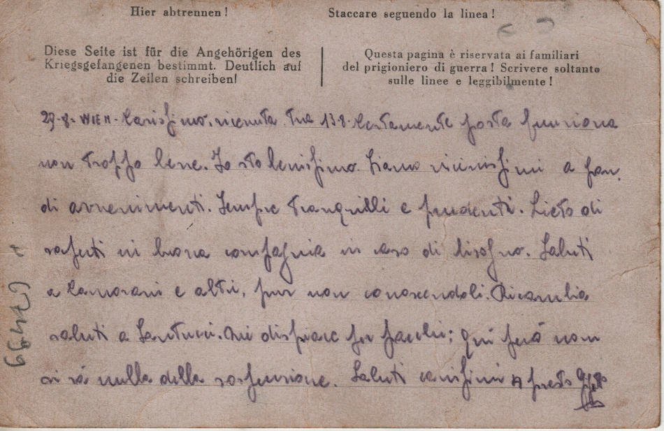 Cartolina scritta il 29.8.1944 nel campo per internati civili a Vienna (Gemeinschaftslager 4) in Austria e spedita al campo di prigionia