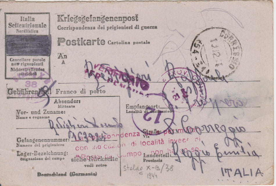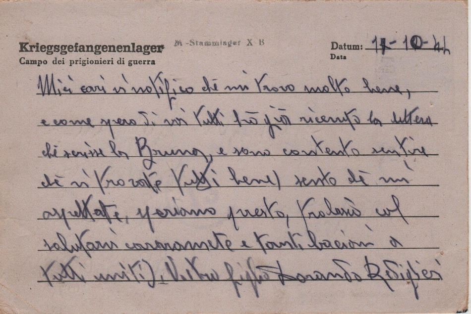 Cartolina scritta il 1.10.44 nel campo di prigionia e spedita a Correggio (provincia di Reggio Emilia) in Italia