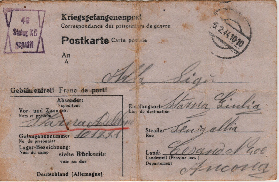 Cartolina scritta il 29.1.1944 nel campo di prigionia e spedita a Senigallia (provincia di Ancona) in Italia