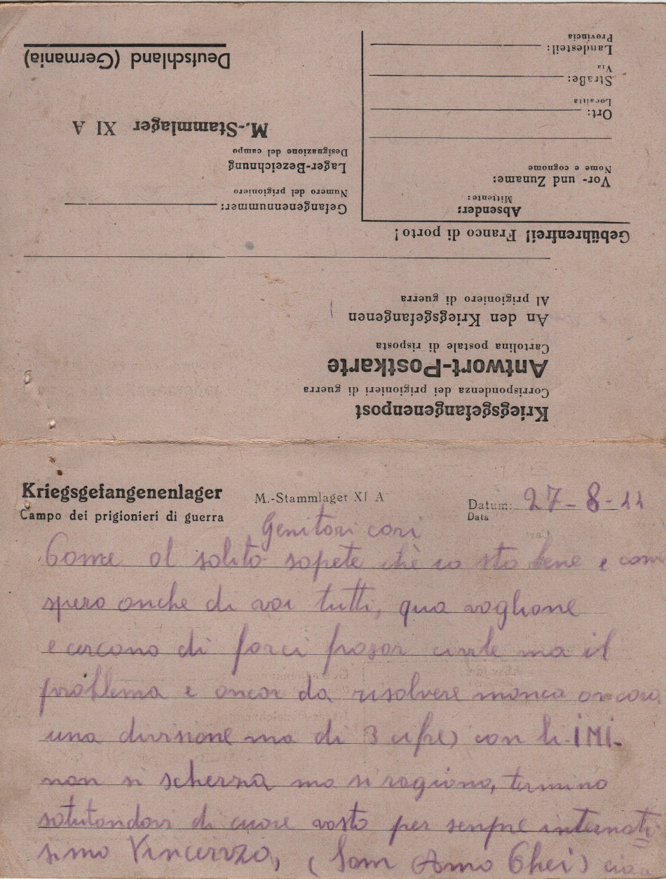 Cartolina scritta il 27.8.1944 nel campo di prigionia e spedita a Ghedi (provincia di Brescia) in Italia