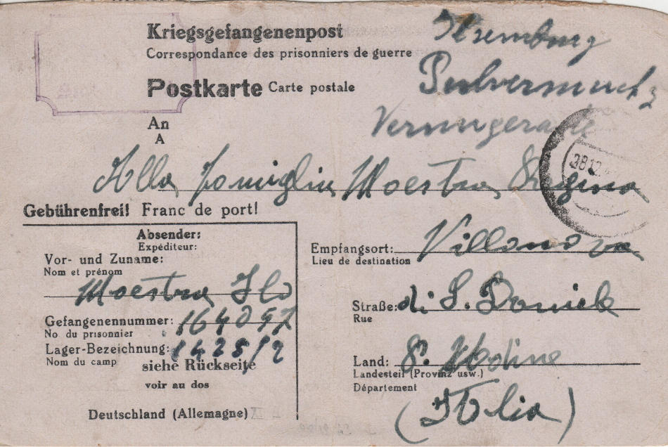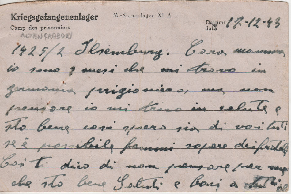 Cartolina scritta il 17.12.1943 nel campo di prigionia e spedita a Villanova (San Daniele del Friuli) in provincia di Udine, Italia