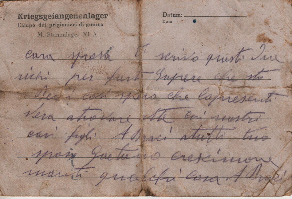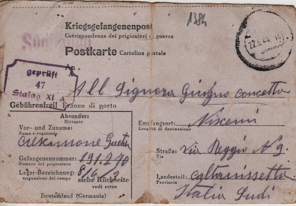 Cartolina scritta nel campo di prigionia e spedita (timbro postale 22.5.1944) a Niscemi (provincia di Caltanissetta) in Italia