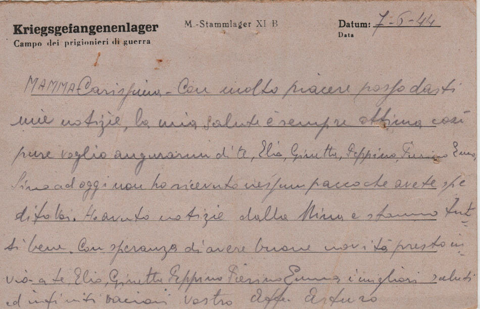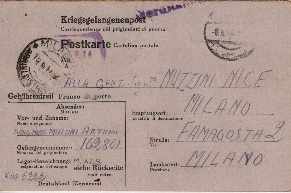 Cartolina scritta il 7.6.1944 nel campo di prigionia e spedita a Milano in Italia