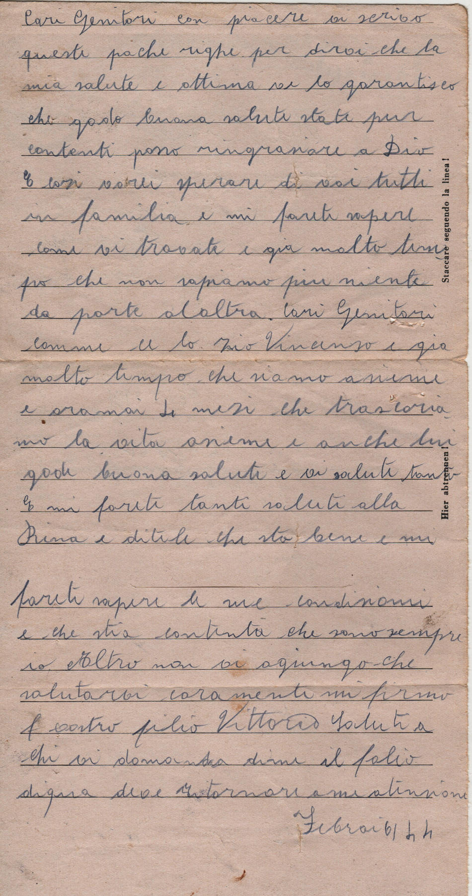 Lettera scritta il 6.2.1944 nel campo di prigionia e spedita a Auditore (provincia di Pesaro) in Italia