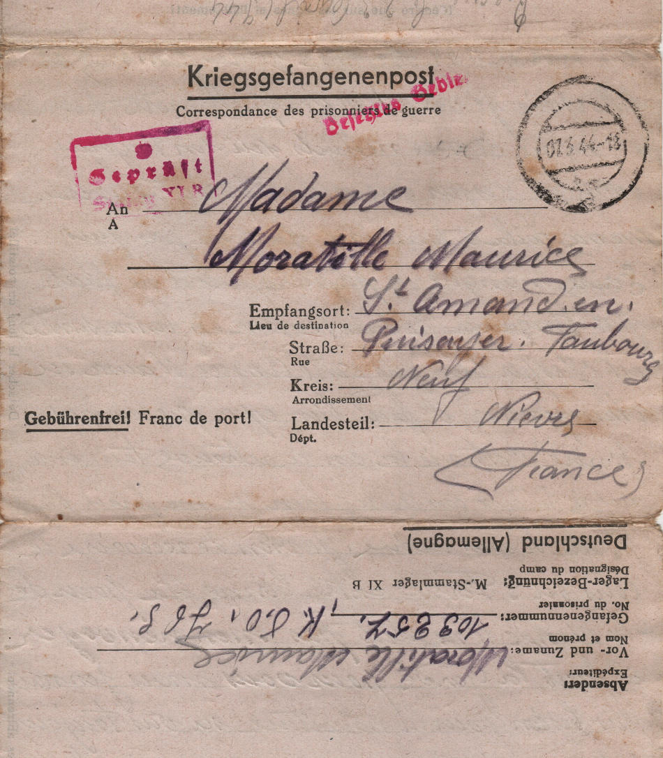 Cartolina scritta il 27.2.1944 nel campo di prigionia e spedita a Saint Amand en Puisaye in Francia