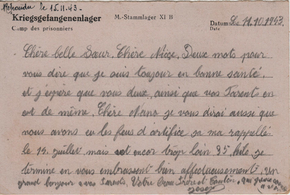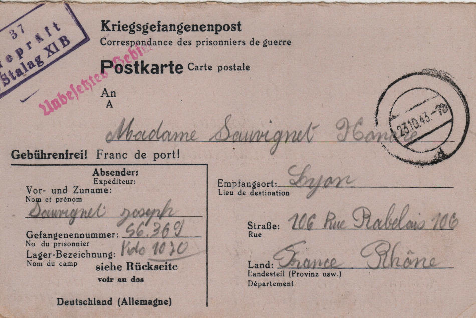 Cartolina scritta il 11.10.1943 nel campo di prigionia e spedita a Lione in Francia