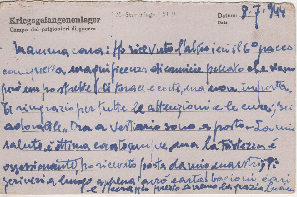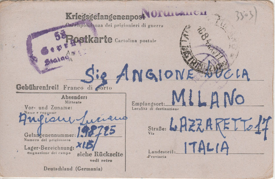 Cartolina scritta il 8.7.1944 nel campo di prigionia e spedita a Milano in Italia