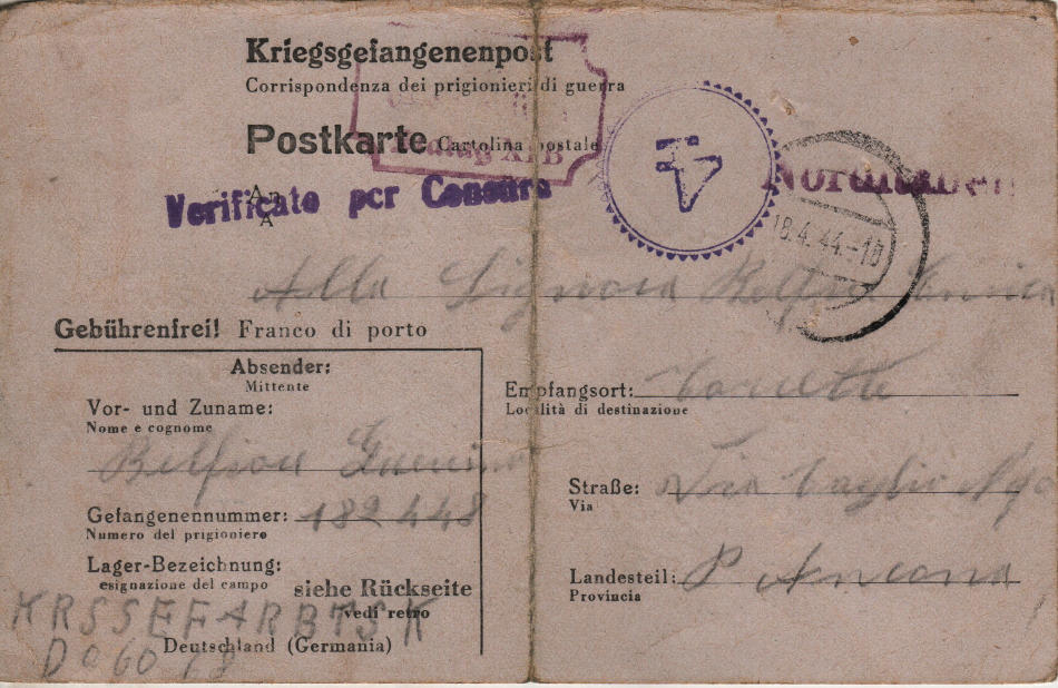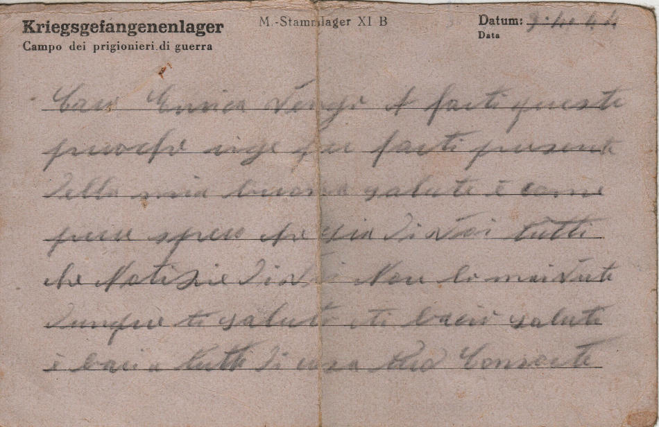 Cartolina scritta il 9.4.1944 nel campo di prigionia e spedita ad Ancona in Italia