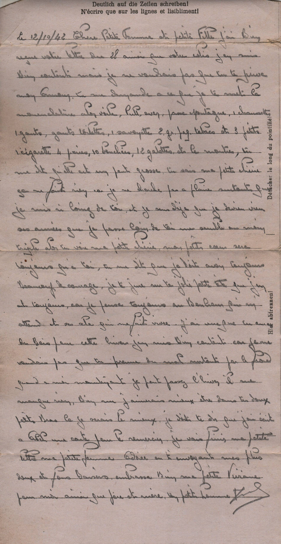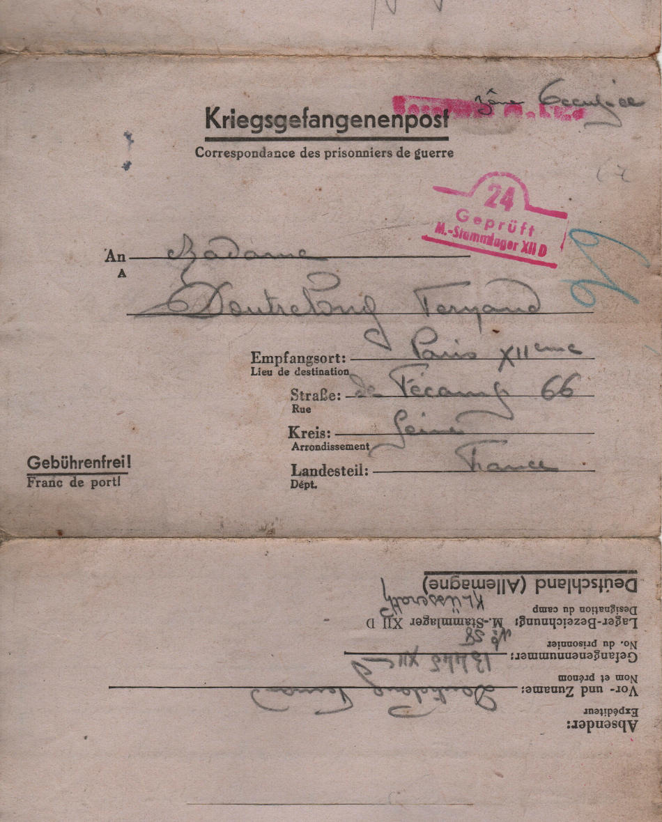 Lettera scritta il 12.10.1942 nel campo di prigionia e spedita a Parigi in Francia