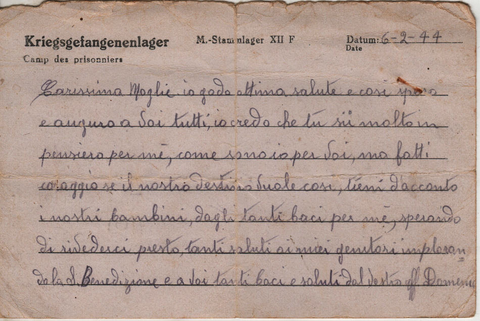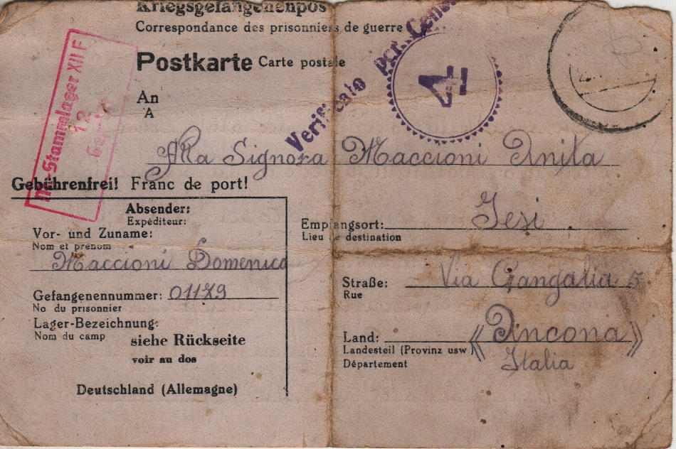 Cartolina scritta il 6.2.1944 nel campo di prigionia e spedita a Jesi, provincia di Ancona, Italia