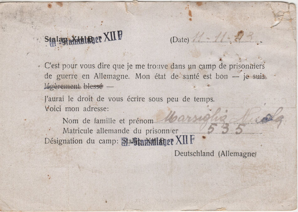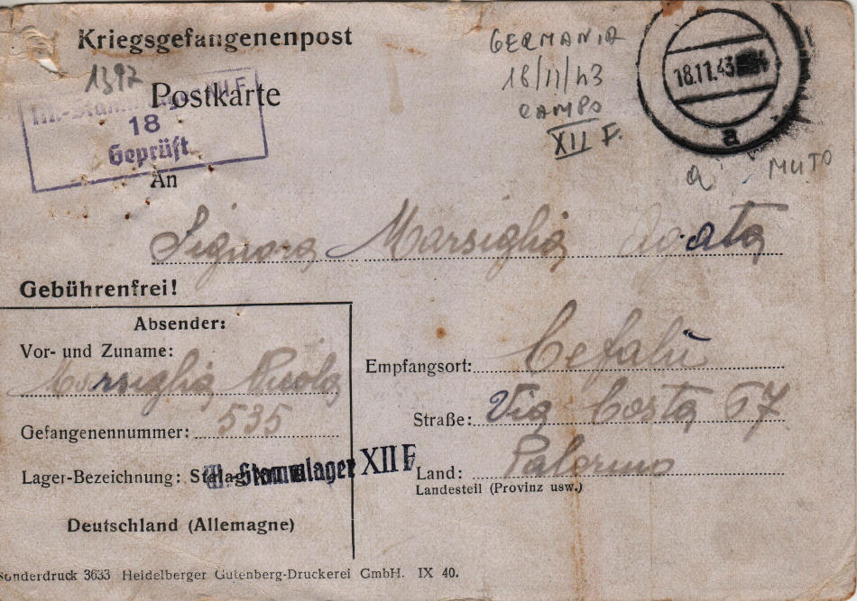 Cartolina precompilata scritta il 11.2.1943 nel campo di prigionia e spedita a Cefalù (provincia di Palermo) in Italia