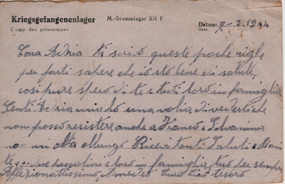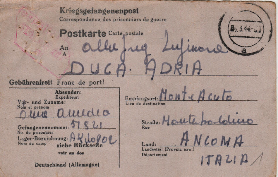 Cartolina scritta il 7.2.1944 nel campo di prigionia e spedita a Montacuto in provincia di Ancona, Italia
