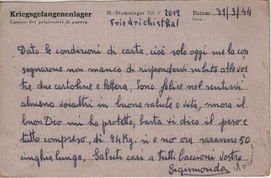 Cartolina scritta il 31.3.1944 nel campo di prigionia e spedita a Domaso (provincia di Como) in Italia