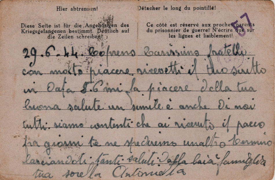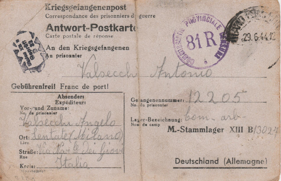 Cartolina scritta il 29.6.1944 a Lentate in provincia di Milano (Italia) e spedita al campo di prigionia